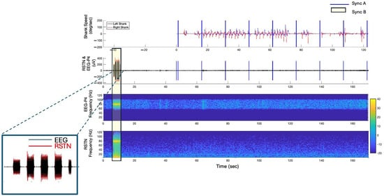 Data alignment between the neural data from the DBS and EEG devices to gait events is achieved by injecting electrical artifacts from the following systems: (1) a Raspberry Pi and (2) a TENS device. A control computer sends a signal to a host Raspberry Pi to signal the VR and video recording to initiate and terminate data collection for each module, and the timing of these events is recorded by the Brain Vision Recorder software (EEG system) (Sync A). The Raspberry Pi also sends synchronization pulses (Sync A) at 15 s intervals to the VR and Brain Vision Recorder systems during each module to detect any time delays between the two systems over the course of a trial. Prior to starting each module, a TENS device is utilized to inject a detectable electrical artifact (multiple 0.5 s on/0.5 s off electrical bursts (250 µs, 80 Hz, and 1.5 mA pulses)) into both the LFP and EEG data streams (Sync B), providing a link between the LFP data and the other systems. Throughout the entire testing session, the Brain Vision Recorder software continuously collects data and serves as the data collection hub, as it captures both the Sync A and Sync B pulses utilized to temporally align the data streams.