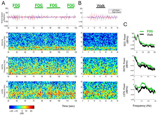 Temporally aligned kinematic, EEG, and LFP data from representative trials in the off–Off condition are presented in Figure 5. Specifically, Figure 5A shows data from the Cognitive module with four clinician-identified FOG epochs. Figure 5B presents data from the Reference module. Visual inspection of the kinematic data supports the accuracy of the clinician’s classification of FOG and Walk epochs, as the shank angular speed is slower during the FOG epochs and faster and more regular during the Walk epoch. The EEG and STN-LFP data from these epochs are illustrated in spectrograms which demonstrate subtle spectral changes over time between the FOG and Walk epochs. Welch’s PSD estimates were calculated across all FOG episodes during the Cognitive module (FOG total time = 40.1 s; Figure 5C—green traces) and all Walk epochs averaged across all modules (Walk total time = 24.4 s) to measure differences in neural activity between FOG (Figure 5C—green traces) and Walk epochs (Figure 5C—black traces). Visual inspection of the PSDs show elevated power (i.e., increased neural synchrony [31]) during the FOG epochs compared to Walking in cortical (P4 EEG electrode—navigational movement area) and subcortical (L- and R-STN) regions for nearly all beta-band frequencies (13–35 Hz).