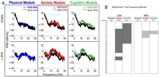 Power spectral densities of STN-LFP data recorded in the off–Off condition showed increased PSDs (i.e., increased neural synchrony) during FOG (color traces) compared to Walk epochs across all three modules (Figure 6A). Gray shaded areas represent frequencies, 1 Hz bands between 8 and 35 Hz, that were significantly different between FOG and Walk epochs (p < 0.05, FDR correction). Figure 6B depicts the differences in the number (N) and the ranges of the elevated 1 Hz frequency across all modules. Compared to Walk epochs, power in the LSTN was elevated across more frequencies than the RSTN during FOG (26 versus 6 significantly elevated 1 Hz bands, respectively). Specifically, power was elevated in the LSTN in the Anxiety (15 bands) and Cognitive (11 bands) modules in the alpha-low beta frequencies (8–20 Hz). For both the RSTN and LSTN, the Anxiety module displayed the largest number of 1 Hz frequency bands that were elevated during FOG and the largest range of elevated frequencies; there were no significant changes in power during FOG compared to Walk in the Physical modules. The Anxiety module was the only module where high beta frequencies (>20 Hz) were significantly different during FOG compared to Walk, and only for the LSTN.