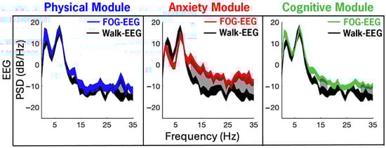 Figure 7 illustrates EEG PSDs from the P4 channel recorded from all therapy during the CC-VHE modules and, consistent with the LFP data, shows increased PSD (i.e., increased neural synchrony) during FOG epochs compared to Walk epochs. Significant differences in power between FOG and Walk were detected in 14%, 80%, and 29% of all 1 Hz frequency bands (1–35 Hz) in the Physical, Anxiety, and Cognitive modules, respectively.