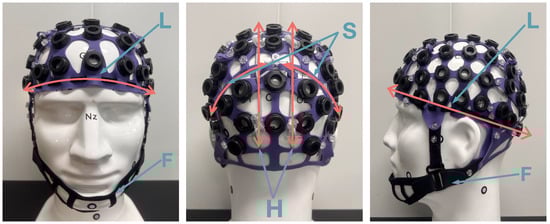 The extracranially collected EEG signals exhibit distinctive features typified by low frequency and diminished amplitude, rendering them prone to disruption by internal and external factors within the biological milieu []. This poses challenges for the acquisition of non-invasive EEG recordings. When installing or placing electrodes on the scalp, it is necessary to have a specific device pressing the electrode on the scalp to fix it and ensure good contact between the electrode and scalp to realize the stable acquisition of EEG signals []. The apparatus typically is a head-adapted EEG cap to fasten all electrodes onto the scalp securely []. EEG caps are commonly fabricated using fabric, elastic polymers, or silicone rubber []. These caps are available in various sizes to accommodate different user head shapes and circumferences, ensuring optimal electrode–head contact to acquire effective EEG signals.