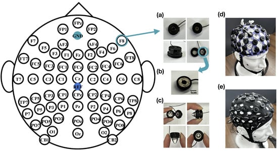 The reference electrode is placed at the CPz position, and the ground electrode is placed at the GND position, as shown in Figure 2. The electrodes of the 4D cap are based on our previous development of PreGel electrodes, suitable for areas with or without hair, and with a correlation coefficient of over 95% with wet electrode EEG signals []. In addition, we have redesigned the electrode placement device to be more convenient than the previous version, significantly reducing the preparation time for experiments. As shown in Figure 2a, the electrodes are mainly composed of hydrogel probes and sintered silver chloride powder. The snap-on cover and house of a PU-based material are used to assemble the hydrogel probe and Ag/AgCl electrode. In Figure 2b, a powder-sintered Ag/AgCl electrode with a diameter of 8 mm was placed onto the lid to provide optimal electrochemical characteristics. The hydrogel probe is placed inside a hollow circular shell with a diameter of 7 mm, and after filling the hydrogel, it can be directly fastened together by a snap. In Figure 2c, this device allows for the repeated opening and closing for the replacement of the hydrogel. The design of the hydrogel electrode probe is conical, with a pointed tip for better penetration of the hair and close contact with the scalp and a flat end for complete contact with the powdered sintered Ag/AgCl electrode on the snap-on cap, ensuring the rate of ion transmission and high conductivity of the entire device. The lower end of the shell is provided with a circular groove, allowing the electrode device to be mounted on the assembly hole reserved in the EEG cap. The electrode lead is directly connected to the Ag/AgCl electrode, with the length determined by the characteristics of the wireless or wired amplifier, typically selected to be between 10 and 150 cm. The physical picture of the 4D cap is shown in Figure 2d.