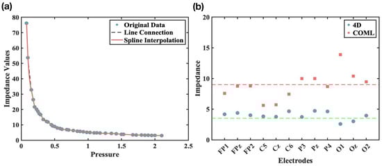 In Figure 3a, the nonlinear relationship between applied pressure and contact impedance is characterized for the PreGel electrode. The study identified an optimal pressure range of 0.2–2.1 N for stable electrode–model interface impedance (3–25 k). The pressure–impedance correlation curve exhibited significant impedance fluctuations (>30 k) at suboptimal pressures (<0.2 N). But on the two types of EEG caps, the PreGel electrode shows different contact effects. The 4D adjustable cap demonstrated superior performance compared with the COML reference. Figure 3b shows that under the same pressure conditions, the impedance of the COML cap is higher than that of the 4D cap, which indicates that the COML cap requires a higher pressure to achieve comparable impedance values. This result quantitatively validates the efficacy of the 4D system’s pressure regulation mechanism.