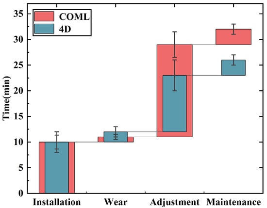 As shown in Figure 4, the impedance adjustment time accounts for the majority of the difference in preparation time between the two caps. The 4D cap requires approximately 3 min to adjust for different head shapes during the wearing process. Compared with the direct wearing of the COML cap, this process involves several additional adjustment steps. However, these steps are crucial for the subsequent impedance adjustment. The average impedance adjustment time is 11 ± 3.2 min for the 4D cap, compared with 17 ± 2.45 min for the COML cap. The fit of the cap to the head shape directly influences the electrode–skin contact, with a better fit leading to faster impedance adjustment. Additionally, the 4D cap provides operators with enhanced flexibility for localized adjustments. For instance, if an electrode in the occipital region requires tightening, the operator can easily adjust the cap by tightening the drawstring in the H dimension, minimizing the impact on other electrodes. This feature makes the 4D cap more user-friendly than the COML cap, resulting in a quicker setup. As a result, the 4D cap enables the experimental process to be completed in less time.