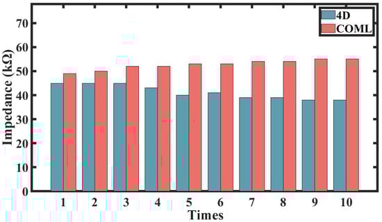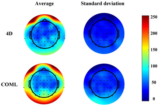 Figure 5 shows the average of 10 recordings of the skin–electrode impedance from the beginning to the end of the experiment. For the COML cap, the average electrode–skin impedance across all channels was 49 K at the start and increased to 55 K by the end, indicating an upward trend. In contrast, the 4D cap started with an average impedance of 45 K and decreased to 38 K by the end, reflecting a downward trend.
