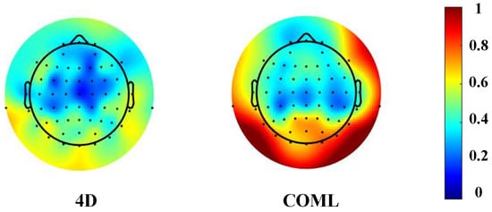 According to the determination of the critical values for each channel, we calculated the relative CR for these two caps of the impedance recordings. As shown in Figure 7, the final result is an average channel reliability of 89% for the COML cap and 97% for the 4D cap. The region where the impedance decreases is consistent with the increase in electrode reliability. The adjustment device of the 4D cap has improved the impedance of the entire brain area, with a particularly noticeable improvement in the occipital region.