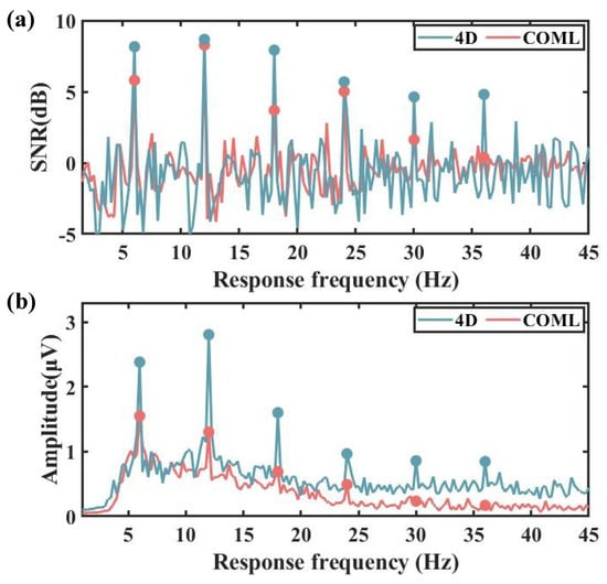 Figure 8a shows the average amplitude spectrum and SNR of the SSVEP. Obvious peaks are evident at the fundamental frequency, along with substantial amplitudes at the second and third harmonics. At 6 Hz, the average amplitude spectrum peaks for the COML cap and the 4D cap are 1.4 V and 2.4 V, respectively, with the 4D cap demonstrating lower noise and higher signal quality.