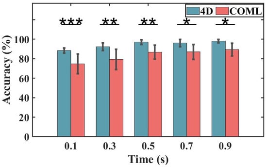 As shown in Figure 9, the two types of caps exhibit significant individual differences in classification accuracy, with the 4D cap demonstrating superior signal transmission performance. For the COML cap, the average accuracy among all participants was 93.33%, and the 4D cap achieved an average accuracy of 98%. A t-test indicated a significant difference (p < 0.05) in classification accuracy between the two caps.