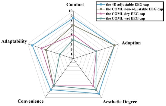 As shown in Figure 11, there is feedback from multiple volunteers. The average comfort rating for the 4D adjustable EEG cap is approximately 8, compared with around 6 for the COML non-adjustable EEG cap. In contrast, the COML dry electrode EEG cap consistently receives a rating below 5, while the COML wet electrode EEG cap averages around 5. This indicates that the gel electrode cap provides a higher level of comfort than both the dry and wet electrode caps. Most volunteers expressed a preference for the 4D adjustable EEG cap, likely due to the cumbersome adjustment process associated with the COML cap. In addition, the 4D cap is more consistent with the head shape and will reduce discomfort and pain during the experiment.