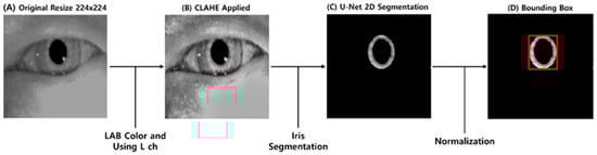 Overview of the preprocessing workflow and resulting outputs. (A) shows a resized VNG frame (from 180 × 120 pixels to 256 × 256 pixels). (B) displays the result of applying CLAHE to the L-channel in the LAB color space. (C) presents the iris segmented using a U-Net-based method. (D) illustrates the bounding box generated on the normalized segmented iris.