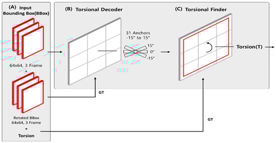 The model comprises two primary modules: the (B) Torsion Decoder and the (C) Torsion Finder, both of which process the same iris bounding box input in parallel. First, the Torsion Decoder (B) generates 31 anchor images by rotating the original image from −15° to +15° in 1° increments. This anchor-based learning strategy explicitly encodes rotational states as feature representations, effectively capturing variations in iris patterns caused by torsion. These intermediate anchor features are essential for enabling precise torsional angle estimation. The output of the Decoder is compared with the actual rotated image for supervision. Subsequently, the Torsion Finder (C) utilizes the anchor features generated by the Decoder to estimate the torsional angle. In this regression stage, the original image is input, and the predicted torsional angle is compared against the ground truth.