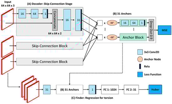As shown in Figure 3, the Decoder module of the Torsion Transformer receives the original image as input and processes it through (A) skip-connection blocks to generate feature maps used in (B) the anchor component. In (A), each input image of size 64 × 64 × 3 is independently passed through a skip-connection block, which consists of a 3 × 3 Conv2D layer. The convolutional layers sequentially extract 16 and then 64 features and finally reshape the feature map to 64 × 64 × 1. A ReLU activation function is applied, and the resulting feature map is concatenated with the original input image to yield a 64 × 64 × 2 tensor. This process preserves both the local features extracted via convolution and the spatial information of the original image. To exploit the strength of skip connections, the model extracts 16 and then 31 feature maps, which are finally reshaped to form the inputs for the anchor processing in (B). The skip-connection block operates on each of the three frames separately, resulting in three independent processing blocks. This architecture is motivated by the sensitivity requirement of the Finder module. The potential issue that training the Decoder on full sequences rather than single frames may increase the temporal gap between frames—thereby reducing torsional sensitivity per frame and possibly lowering estimation accuracy—has been further discussed in the Section 3.