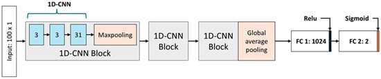 Architecture of the nystagmus detection model. The model takes a 100 × 1 sequence of torsional angles as input and is composed of three 1D-CNN blocks followed by two fully connected (FC) layers. Each 1D-CNN block consists of three 1D convolutional layers and one max-pooling layer. In the figure, gray boxes denote 1D-CNN blocks, blue boxes indicate 1D convolutional layers, and orange boxes represent pooling layers. The final block replaces max-pooling with global average pooling. The output passes through a fully connected layer with 1024 neurons, followed by a second FC layer with 2 neurons for binary classification.