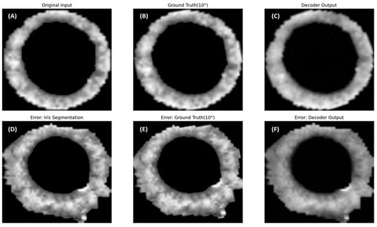 Representative cases of successful and failed torsional angle predictions by the Finder module. Panels (A–C) show examples in which the Finder accurately predicted the torsional angle. These images were also qualitatively evaluated as successful cases of iris segmentation. Specifically, (A) shows the original image, (B) is the same image rotated by 10 degrees, and (C) is the output generated by the Decoder using (A) as input. In contrast, panels (D–F) depict cases where the Finder failed to estimate the torsional angle accurately. These were qualitatively assessed as having segmentation errors during the iris extraction process. Panel (D) is the original image, which exhibits segmentation artifacts; (E) shows the image rotated by 10 degrees; and (F) is the Decoder-generated image based on (D) as input.
