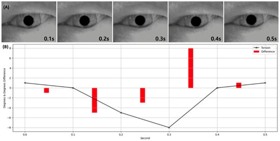 Visualization of the torsion output from the Finder module alongside the corresponding VNG image. Panel (A) displays a VNG image corresponding to a timepoint where torsional nystagmus was detected. Panel (B) presents a graph of the torsional angle predicted by the Finder, with values plotted at 0.1 s intervals. Red bars indicate the magnitude of change in torsion over time.