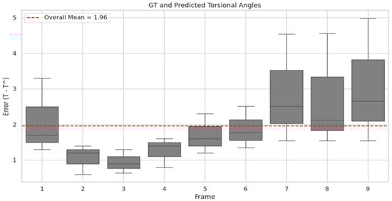Distribution of torsional angle error across Transformer input frames. The x-axis represents the frame index of input images to the Transformer, while the y-axis shows the distribution of the difference between the predicted torsional angle (T^) by the Finder and the GT. The red line indicates the mean angular error across all frames.