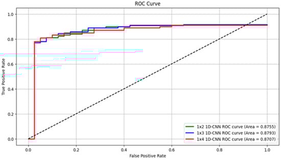 In this study, we proposed a 1D-CNN-based model to detect torsional nystagmus using torsional angles estimated by the Torsion Finder. Specifically, the Finder computes a single torsional angle from every sequence of three consecutive frames, yielding one torsion value per 0.1 s video segment. To optimize detection across varying durations of VNG segments, we evaluated model performance by altering the length of the sequential torsional angle input. Table 2 summarizes the performance metrics as the number of input torsion values increases from 2 to 9, corresponding to segment durations ranging from 0.2 to 0.9 s. The model using a 0.3 s VNG segment achieved the best overall performance, with 89.99% sensitivity, 86.36% specificity, 87.67% precision, 87.57% accuracy, and an F1-score of 88.82%. Notably, the model trained on 0.2 s segments achieved the highest specificity (88.37%) and precision (89.74%). However, performance gradually declined as the segment length exceeded 0.4 s, and dropped significantly below 80% after 0.6 s. Figure 8 presents the ROC curves of the top-performing models reported in Table 2. The model trained with 0.3 s segments achieved the highest area under the ROC curve (AUROC = 0.8793), followed by the 0.2 s model (AUROC = 0.8755) and the 0.4 s model (AUROC = 0.8707).