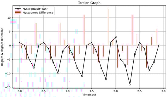 Presents a graph displaying torsional values over continuous time as derived from the VNG video. In this figure, the torsional angle is denoted by “x” and the corresponding variations in torsional angles are illustrated using red bars.