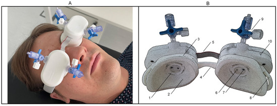 Non-invasive intracranial pressure wave monitor ‘Archimedes 02’. (A)—Front view of the device placed on both closed eyelids of a healthy volunteer. (B)—Back view of the device, rendered with a poster edge filter to enhance the visualization of the inner parts of the sensor cups: 1—locking mechanism for connecting the sensor module to the disposable cup; 2—transparent elastic film covering the bottom part of the cup; 3—disposable cup; 4—bridge element connecting the right and left cups; 5—signal cable; 6—injection port for liquid; 7—pressure sensor port; 8—buckle for connecting a headband; 9—stopcock for connecting source of liquid; 10—sensor module.