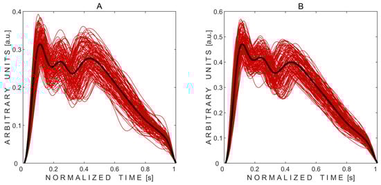 Non-invasively recorded averaged pressure pulse waves (thick black curves) obtained from the left (A) and right (B) eyes of the subject. Thin red curves represent the recorded pulse waves modulated by physiological intracranial pressure respiratory and slow waves.