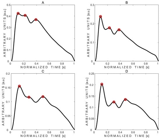 Examples of averaged pressure pulse waves with three automatically detected peaks marked with red circles. (A,B)—pulse waves recorded from subject No. 2’s left and right eyes, respectively. (C,D)—pulse waves recorded from subject No. 10’s left and right eyes, respectively.