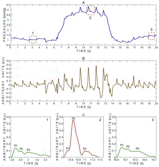Example of pressure pulse waves recorded from a single subject using the ‘Archimedes 02’ device during the Valsalva maneuver. (A)—Raw signal data with three segmented pressure pulse waves indicated by red dashed rectangles: 1—before the Valsalva maneuver; 2—during the maneuver; and 3—during recovery after the maneuver. (B)—detrended signal data. (C)—Segmented pressure pulse waves extracted from the same subject and corresponding time intervals indicated by red dashed rectangles in (A): 1—before the Valsalva maneuver; 2—during the maneuver; and 3—during recovery after the maneuver. P1—first peak; P2—second peak; P3—third peak.
