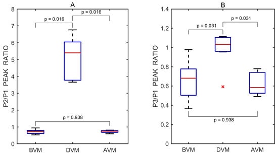 Boxplots of P2/P1 (A) and P3/P1 (B) peak ratios derived from all recorded pulse wave measurements obtained before (BVM), during (DVM), and after (AVM) the Valsalva maneuver. Red lines indicate medians. A red cross (×) marks a statistical outlier. p values represent results from pairwise statistical comparisons.