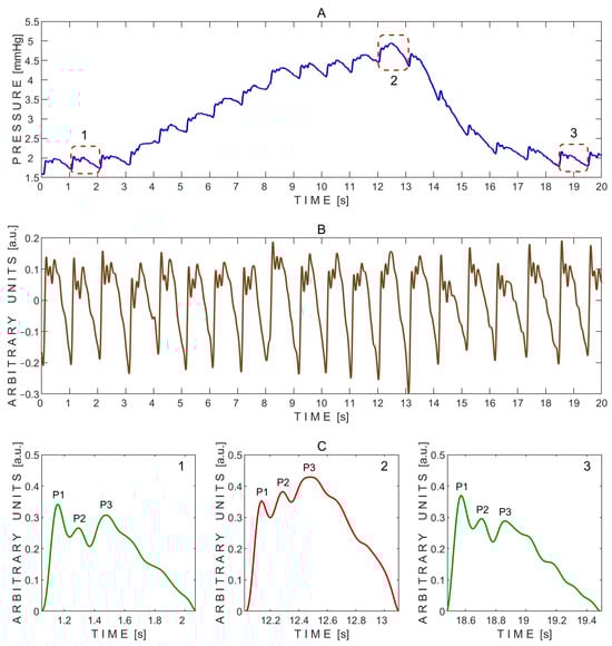 Example of pressure pulse waves recorded from a single subject using the ‘Archimedes 02’ device during the Queckenstedt test. (A)—Raw signal data with three segmented pressure pulse waves indicated by red dashed rectangles: 1—before the Queckenstedt test; 2—during the test; and 3—during recovery after the test. (B)—Detrended signal data. (C)—Segmented pressure pulse waves extracted from the same subject and corresponding time intervals indicated by red dashed rectangles in (A): 1—before the Queckenstedt test; 2—during the test; and 3—during recovery after the test. P1—first peak; P2—second peak; P3—third peak.