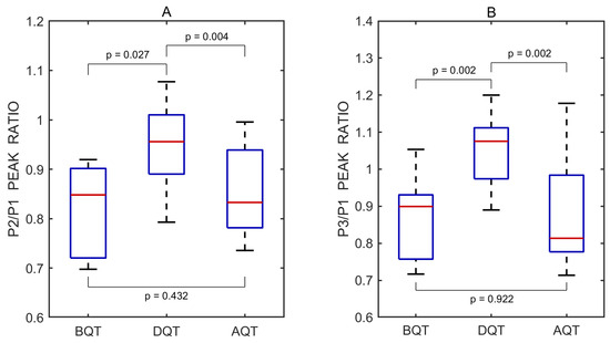 Boxplots of P2/P1 (A) and P3/P1 (B) peak ratios derived from all recorded pulse wave measurements obtained before (BQT), during (DQT), and after (AQT) the Queckenstedt test. Red lines indicate medians. p values represent results from pairwise statistical comparisons.