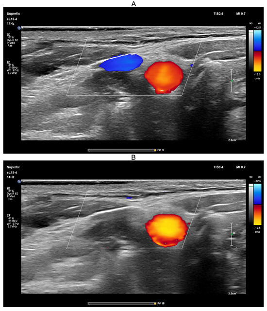 Screenshots from the PHILIPS EPIQ Elite ultrasound triplex scanner during the ultrasound-guided common carotid artery compression test (transient hypoemic/hyperemic response test). (A)—Before compression of the common carotid artery; (B)—During compression of the common carotid artery.