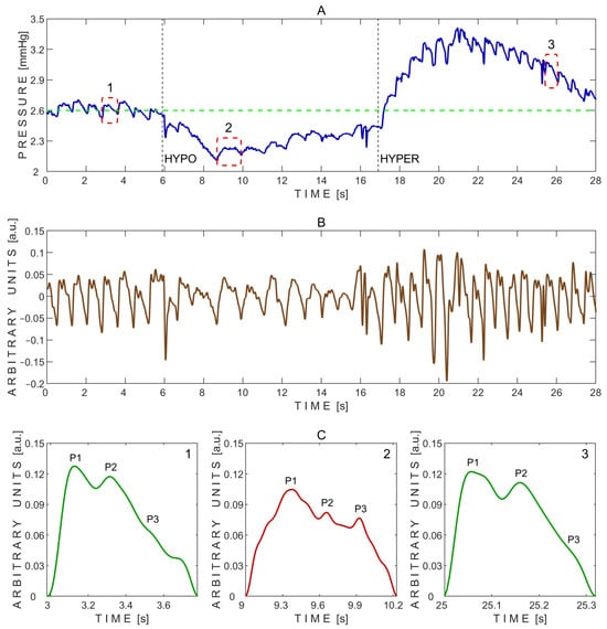 Example of pressure pulse waves recorded from a single subject using the ‘Archimedes 02’ device during the transient hypoemic/hyperemic response test. (A)—Raw signal data with three segmented pressure pulse waves indicated by red dashed rectangles: 1—before the test; 2—during the test; and 3—during recovery after the test. HYPO indicates the moment of fast compression of the common carotid artery, and HYPER indicates the moment of rapid release. The green dashed line marks the baseline pressure before the test. (B)—Detrended signal data. (C)—Segmented pressure pulse waves extracted from the same subject and corresponding time intervals indicated by red dashed rectangles in (A): 1—before the test; 2—during the test; and 3—during recovery after the test. P1—first peak; P2—second peak; P3—third peak.