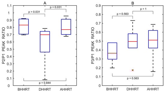 Boxplots of P2/P1 (A) and P3/P1 (B) peak ratios derived from all recorded pulse wave measurements obtained before (BHHRT), during (DHHRT), and after (AHHRT) the transient hypoemic/hyperemic response test. Red lines indicate medians. A red cross (×) marks a statistical outlier. p values represent results from pairwise statistical comparisons.