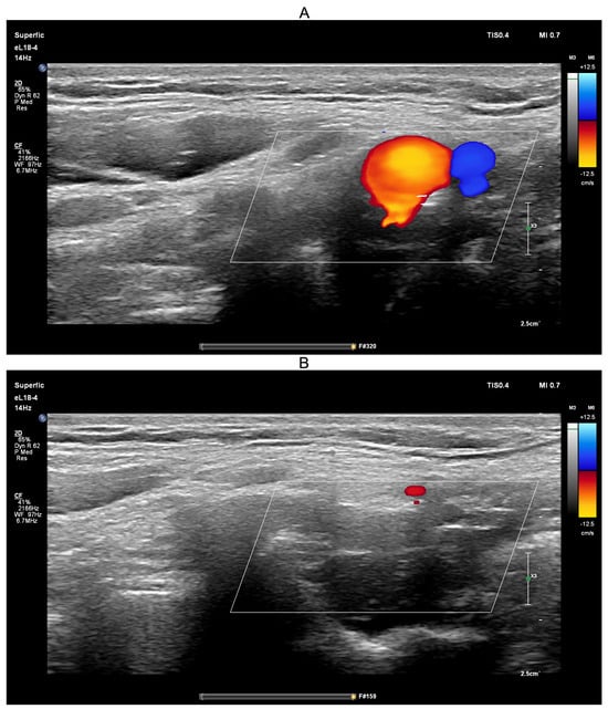 Screenshots from the PHILIPS EPIQ Elite ultrasound triplex scanner during the ultrasound-guided jugular vein compression test (Queckenstedt’s test). (A)—Before compression of the jugular veins; (B)—During compression of the jugular veins.