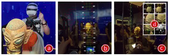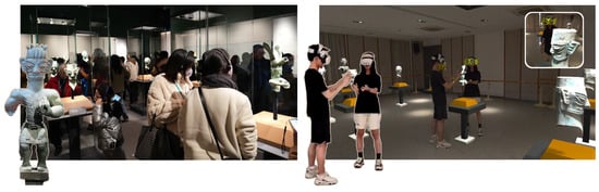 With people’s increasing interest in museum exhibitions [], physical museums (PM) are seeing a surge in visitor numbers. However, high visitor traffic often hinders individuals from closely observing exhibits, negatively impacting the overall experience (Figure 1, left). In response, virtual museums have emerged as a significant medium for cultural dissemination, providing a new way for people to engage with historical artifacts [,]. Compared to traditional museums, virtual museums offer advantages such as digitization, interactivity, and the elimination of geographic barriers, allowing audiences to access exhibits at any time and from any location [].