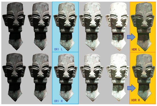 To produce HDR images, we captured five consecutive exposures at each shooting point using different shutter speeds, resulting in five sets of RAW images. For each artifact, images were captured from the left and right viewpoints at four different angles, resulting in eight synthesized HDR images (Figure 3). These high-quality inputs significantly improved texture reproduction and contributed to the overall visual realism of the final models.