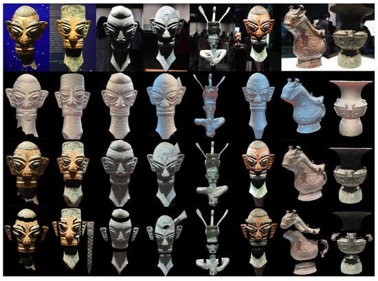 Bronze, one of the earliest alloys invented by humans, is regarded as a symbol of civilization and held a sacred status in China for many centuries []. In this study, we selected the bronze exhibition hall as our research environment, employing various techniques to construct a virtual museum that closely replicates the real exhibit displays.