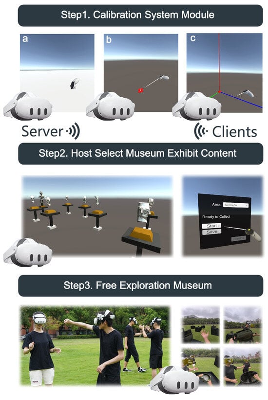 The digitization process for each exhibition area involves at least one day of on-site image capture, followed by 5–10 h of 3D modeling per exhibit by a trained artist. The system was implemented in Unity using an RTX 3090 GPU, with core functionality developed within approximately one week. Its modular design supports rapid integration of new exhibits, making it adaptable for use in various heritage or exhibition settings.