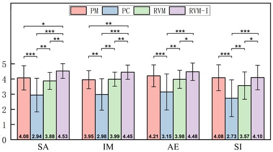 Among PM, RVM, and RVM-I, satisfaction was highest for RVM-I, with a notable difference compared to RVM. Although the exhibits in PM featured the most refined shapes and textures, the crowd reduced audience satisfaction in terms of cultural engagement. Participants were distracted by the crowd and its diverse behaviors, which interfered with their ability to fully appreciate the artifacts and absorb cultural information. While RVM’s exhibit detail was slightly lower than PM’s, it avoided the disruptive effects of large crowds. Despite the absence of interactivity, participants showed more focused engagement with the artifacts, as supported by behavioral data presented in Section 5.3. In RVM-I, the interactive features enhanced exhibit appeal and increased perceived authenticity, helping to offset the impact of reduced visual detail compared to PM.