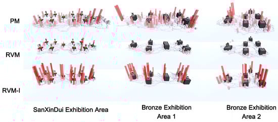 We selected the bronze exhibition area and the Sanxingdui exhibition area from a renowned museum as our experimental environment, faithfully replicating the exhibits and exhibition configuration in the RVM system. To overcome challenges such as low lighting, the inability to touch artifacts, and limitations on photography in physical museums, we developed a virtual reality (VR) stereoscopic photography guidance system. By synthesizing multiple images, we generated high dynamic range (HDR) binocular visuals [,] and employed multi-view stereo reconstruction technology [,] to create accurate 3D models of the artifacts, aiming to closely replicate the physical exhibition space in the virtual museum.