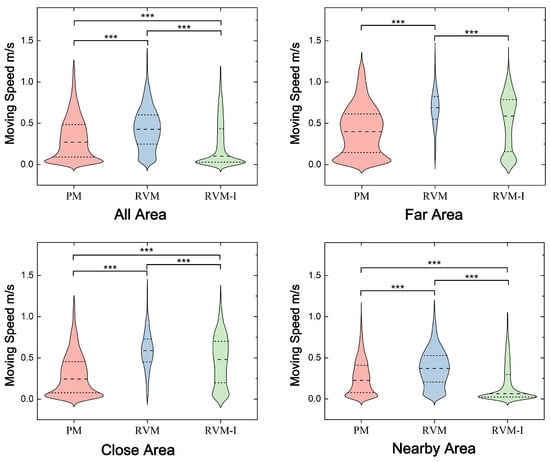 Significant differences were observed in effective experience time across the different modes. The proportion of effective experience time ranked as RVM-I ≈ RVM > PM. In the RVM-I and RVM modes, effective experience time nearly doubled compared to the PM group, while movement efficiency remained consistent across all modes. This suggests that crowding in the physical museum had a considerable impact on viewing efficiency, as participants’ direct paths to exhibits were often blocked, and popular artifacts were surrounded by participants, leading to wait times before approaching displays. In terms of overall effective experience time, the ranking was RVM-I > RVM ≈ PM, indicating that RVM and PM were similarly engaging for participants, though RVM required significantly less movement time than PM. The increase in effective experience time in RVM-I is attributed to the interactivity of the exhibits, allowing viewers to appreciate the exhibits from multiple angles in a more natural way and discover more easily overlooked details, which directly led to a significant increase in effective experience time.