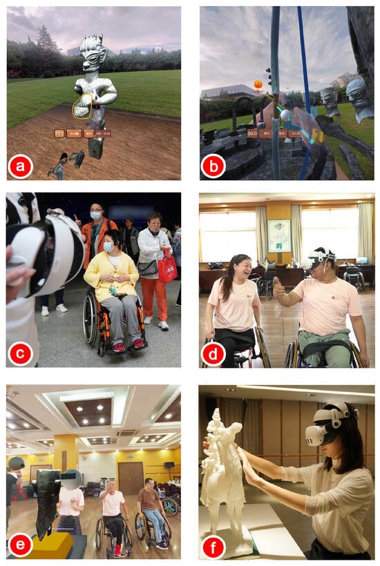 The future expansion direction of RVM will target more special groups of people and enhance interactive fun, helping more people to accept the information behind cultural relics. (a,b) Games; (c,d) accessibility for physically disabled; (e) multi-user system; (f) touch-based museum interface.