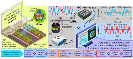 Vibration sensing based on optical fiber sensors plays a critical role in numerous domains, ranging from industrial fast-rotating machinery monitoring and diagnostics to emerging fields such as smart agriculture, cyber–physical systems, downhole measurement, energy harvesting, and autonomous vehicle systems [,,,,,]. These applications that produce high-frequency waveforms increasingly demand high-sampling-resolution vibration analysis to ensure operational integrity, predictive maintenance, and system-level intelligence.