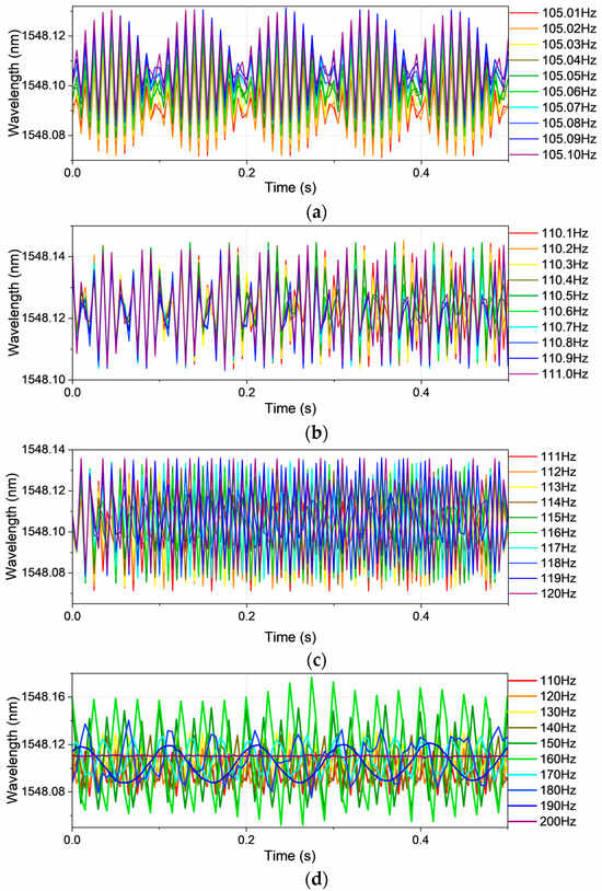 The time-domain vibration waveform for Case 1: (a) frequency 105.01–105.10 Hz with data spacing 0.01 Hz; (b) frequency 110.1–111.0 Hz with data spacing 0.1 Hz; (c) frequency 111–120 Hz with data spacing 1 Hz; (d) frequency 110–200 Hz with data spacing 10 Hz.