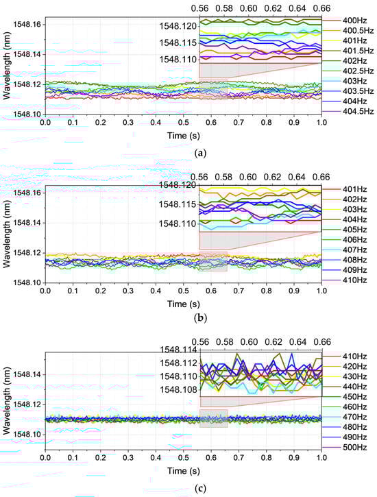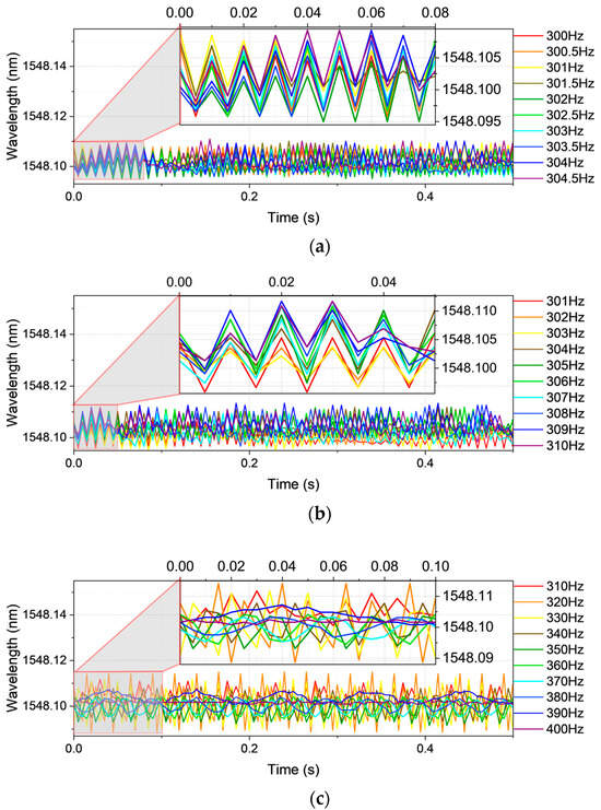 Vibration frequency Case 2, delineated in Figure 3, further corroborates this constraint. The waveforms span 300.0–304.5 Hz at 0.5 Hz spacing (Figure 3a), 301–310 Hz at 1 Hz (Figure 3b), and 310–400 Hz at 10 Hz (Figure 3c). In this case, the frequency content surpasses the intrinsic sampling threshold of the FBG interrogator (200 Hz), leading to spectral attenuation and diminished power magnitude relative to Case 1 (100–200 Hz). This misalignment between signal content and sampling capacity erodes temporal fidelity, rendering the time-domain representation increasingly indistinct.