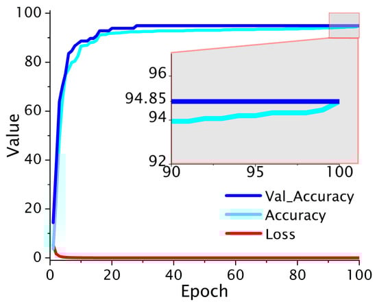 The performance trajectory of the proposed deep learning model reveals both expedited convergence and long-term stability, as substantiated by its validation accuracy and loss dynamics. Notably, the model attains a stable validation accuracy of 94.85% from epoch 33 onward, maintaining this high precision through epoch 100, thereby demonstrating both convergence and generalization capability as shown in Figure 7. The loss curve reaches its global minimum by epoch 7, indicating early stabilization of the network’s internal feature abstraction and suggesting a well-conditioned optimization landscape.
