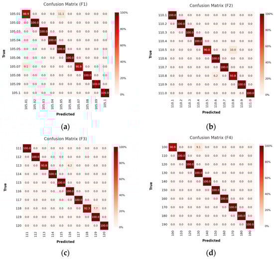 The framework’s efficacy is further corroborated through confusion matrices derived from a comprehensive suite of high-resolution frequency classification tasks, wherein initial and terminal frequencies were systematically varied to evaluate the model’s adaptability across disparate high-frequency regimes. In vibration frequency Case 1 (Figure 8), the model exhibits remarkable acuity in discriminating narrowly spaced signals, 105.01–105.10 Hz at ultra-fine 0.01 Hz increments (Figure 8a) and 110.1–111.0 Hz at 0.1 Hz (Figure 8b), as well as broader spans such as 111–120 Hz at 1 Hz and 100–190 Hz at 10 Hz intervals (Figure 8c,d, respectively).
