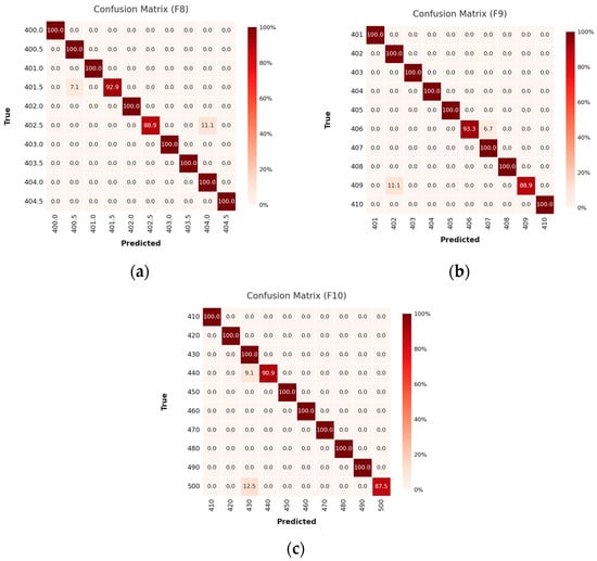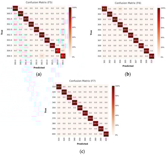 The confusion matrices display sharply delineated classification boundaries and a negligible misclassification rate, affirming the model’s precision in resolving subtle spectral variations. This pattern of robust performance persists in vibration frequency Case 2 (Figure 9), where the model accurately categorizes signals across the 300.0–304.5 Hz range at 0.5 Hz spacing (Figure 9a), 301–310 Hz at 1 Hz (Figure 9b), and 310–400 Hz at 10 Hz (Figure 9c). The model sustains high fidelity even under coarser frequency discretization, reflecting its scalability across multi-resolution domains.