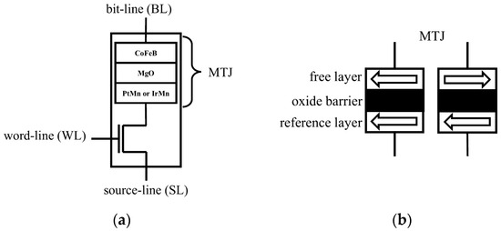 (a) STT-MRAM cell; (b) parallel state (PS) and antiparallel state (AS).