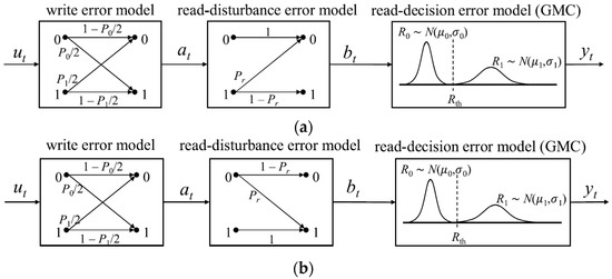 Cascaded channel model. (a) Reading with a write-0 direction. (b) Reading with a write-1 direction.