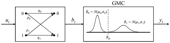 As mentioned earlier, write and read failure rates are key contributors to system performance degradation, significantly impacting system reliability. The parameters and denote the write error rates for 0 → 1 and 1 → 0 switching in the same order. The cascaded channel model combines the write error and read error models. The write error model is represented by a binary asymmetric channel (BAC), where the error probabilities for 0 → 1 and 1 → 0 are denoted as and , respectively. The read error model is divided into two components: the read disturbance error and the read decision error. The read disturbance error is modeled by a Z-channel, with representing the crossover probability of 1 → 0 or 0 → 1 during the reading process in the write-0 or write-1 direction, respectively. The read decision error is modeled using a Gaussian mixture channel (GMC), where a Gaussian variable , with mean and variance , represents low resistance and , with mean and variance , represents high resistance. These three models (the write error model BAC, the Z-channel for read disturbance errors, and the GMC for read decision errors) are combined to form the cascaded channel model. Figure 4 illustrates the diagram of this cascaded channel model.